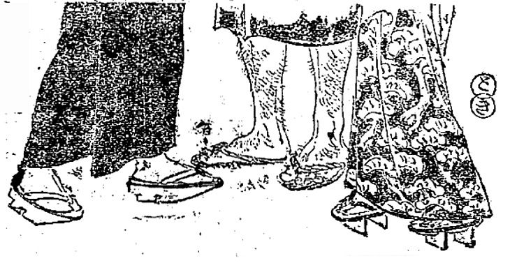 | 説明 | この作品を手がけた画家は、ふつうの画面の一部分を描くことで全体を暗示する手法を好んだようだ。画家の名は確かにはわからない。しかし、いくぶん謎解きめいていて、読者にも受けなかったのか、長続きはしなかった。この日の挿絵では三人の人物のきものの裾と足先だけを示している。右側の男は黒っぽいきものを、といっても実際は濃い紺系の色だろうが、ふつうに重ねている。それに対して真ん中の男は土地の農夫で、丈のかなり短いきものの裾から毛ずねが現れている。農漁民でも職人でも労働する人間にとっては、裾の長いきものはわずらわしい。丈の短いきもの――半纏の類の短着を着る連中といえば、それは彼らの身分を表す。貧乏人の着るものは、半纏などではないふつうのきものでも丈は短めで、身幅も狭くなる。それは用布を節約するためもあり、裾や襟の傷んだのを隠すためもあり、逆にそれが七三仕立てのような見栄にもなった。すべてが手づくりの時代、裂地は現代と比べると相対的に非常に高価だったから、布をたっぷり使って十分に身体を包むということは、貧乏人には許されなかった。(大丸 弘) |