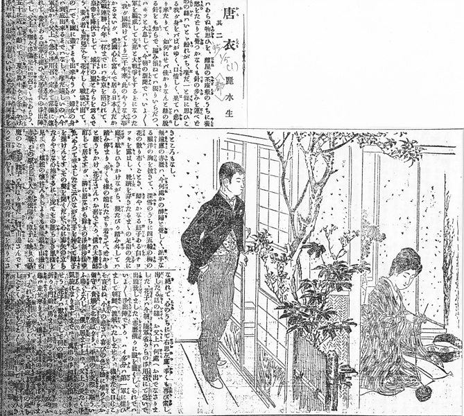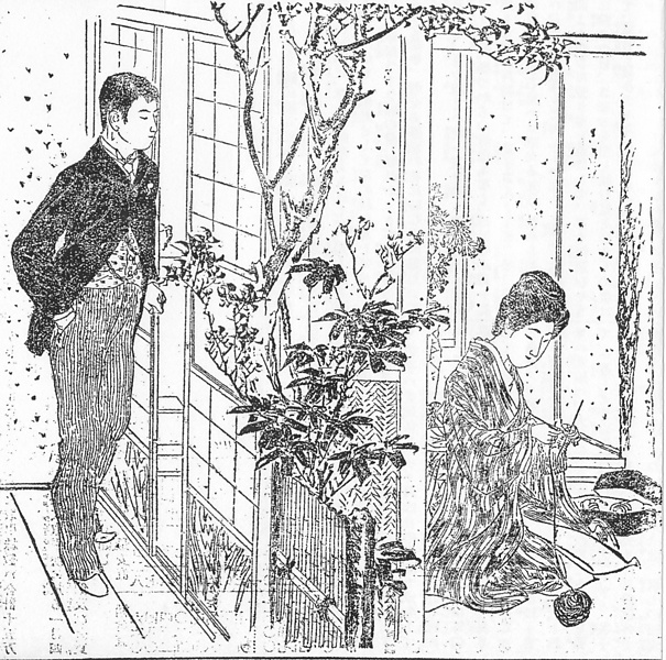 説明 案内も乞わず庭伝いに隣家に入り込み、勝手に廊下に上がり込んで、編物をしているお嬢さんにまといついている若者。この若者は男爵家の跡取り息子で、素行が悪く、いま宴会の席から酒に酔って戻ったところ。「派手なる洋服の胸を披(ヒラ)きて、深雪のうちに四五輪の梅の花の散り敷くごとき、鮮やかなる紐子(ボタン)ある白チョッキを露わし」というモーニング姿。娘は髪を縦型の束髪に結い、このころは東京などではもう流行りというより、中流家庭の女性の趣味として定着していた編物の最中。娘のいるのは離れの茶室。凝った自然木を使った床の間、網代壁、袖垣、そして廊下に面した明かり障子は横額入りのガラス障子と、古風さとハイカラを取り混ぜたこの家の主人の好みが窺える。(大丸 弘)