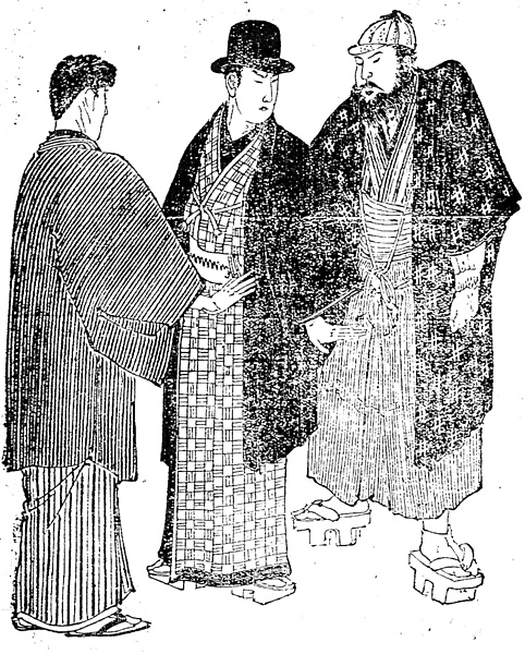 | 説明 | 書生羽織といわれる男羽織の、1880年代(ほぼ明治10年代)あたりまでの本来のものは、綿の入った防寒用の長羽織であり、表立ったところへ着て行けるものではなかった。右端の髭男は警視庁の刑事で、刑事はこの時代、捜査に当たってはかならず袴を穿くよう求められていて、これは職務上の恰好になる。本来の書生羽織は無骨な薩摩絣が多かった。帯が幅の広い兵児帯で、羽織の紐がその帯の下まであるのも書生羽織の特色。刑事の方は履いている下駄までまな板のような薩摩下駄。和服には洋服のような外套というものがない。寒ければ綿入れのきものの重ね着をするだけ。トンビとか二重回しと呼ばれた二重外套は、洋服屋に注文して作る洋服の一種で、この時代、だれにも手の届くというものではなかった。(大丸 弘) |