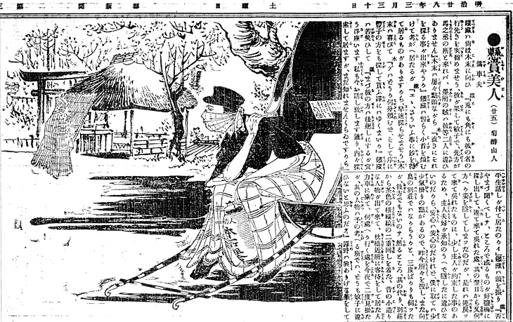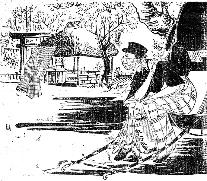説明 客待ちの人力車夫が、謎の二重廻しの人物を探索しているという筋書き。二重廻しは茶色の横竪縞――つまり格子柄ということ。格子柄も比較的少ないが、それ以上に、天気が悪いというわけでもないのに、二重廻しフードを被って歩く人はめずらしい。車夫が腰に巻いているケットは客用のもの。こういう使い方をするので、女客などは人力のケットを汚いと言って嫌った。(大丸 弘)