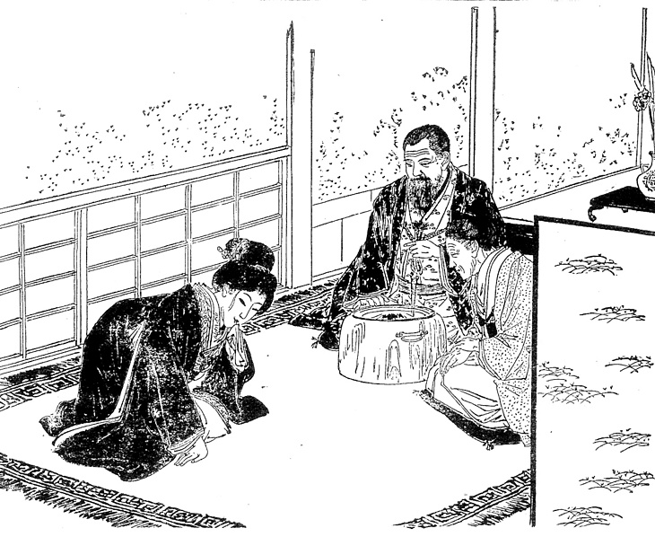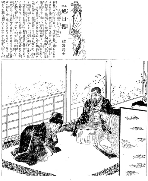 | 説明 | 息子の嫁にするつもりでひとりの娘を家に置いてまもなく、その息子は日清戦争(1894年,1895年)に応召し、やがて帰らぬ人になった。身の置き場がないような女に、「お前はまことに従順(オトナ)しくって神妙だから今更帰すのは惜しいけれども、お前の実家に対しても早く帰さなければならない」と義理の父母からの言い渡し。女の後ろに下地窓があり、小さめの床の間や壁の設えなど、茶室風の離れ。プライヴァシーの守りにくい和風の住宅では、人の耳に入れたくないような話をする場所としても、離れが有効に使われた。両親、嫁ともに羽織を着ているのは、なにも改まった話というわけではなく、単に防寒着というだけ。目上の人の前でものを言う場合の、嫁の手の突き方は法に適っている。嫁とはいうもののまだ正式の祝言前なので、髪は高島田。その嫁が、襦袢の袖を引きだして噛んでいるが、ふつうにはこれは悔しさの表現。(大丸 弘) |