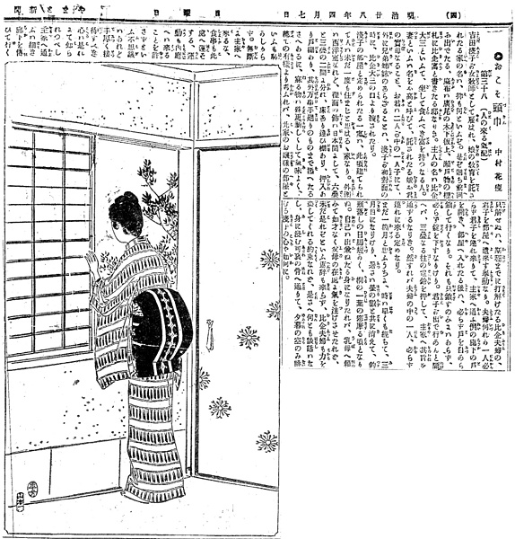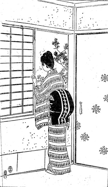 説明 家庭教師として雇われた若い女性。雇ったのは広尾辺りの「座して食らうべき富をもつ」ような家。個室としてあてがわれたけっこうな部屋の窓から外を見ている。外見は西洋館で内部の造りは和風、という構造は、日本の住宅では現代もある程度引き継がれている。女性が手を掛けているのは紙の障子だが、この外に上下に開閉するガラス戸があるという。彼女の着ているきものの柄はめずらしいが、上品なお太鼓に締めている帯はよくある平凡な柄。(大丸 弘)