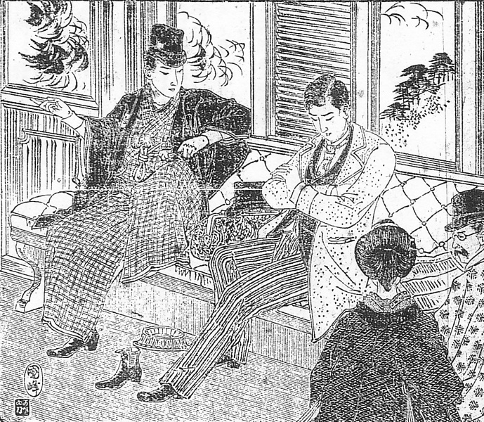 | 説明 | 東海道線のおそらく一等車の車内。髪を七三分けにしている主人公の若者は、モーニングに霜降りのコートを重ねていて、いかにも豊かそうで、瀟洒なスタイル。隣の友人は片方の靴を脱いで立て膝した不作法な恰好。この若者は縞のきものに黒羽織という和装に、かなり山の高い帽子を被って靴を履いているのは洋式。和服の上に被るものと穿くもの、つまりアクセサリーや下着類――時計や眼鏡、ネルのシャツなどだけが西洋風、という点に、洋風受け入れの最初の段階のひとつのパターンが認められる。(大丸 弘) |