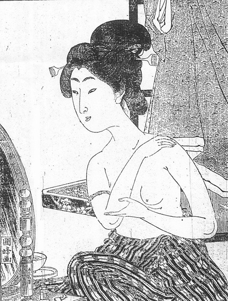 | 説明 | 夫が逝ってから三月も経たないうちに、紅白粉に身をやつしはじめた後添いの妻。丸髷の大きさはこの後家の心根を表現している。髪に挿しているのは撫でつけに使う毛筋の櫛。ブレスレット、指輪も目立つ。この女性が脱いだきものは後ろに吊してある重ねの袷だろうが、いま肌脱ぎしているのは長襦袢だろうか。歌川国峰のこの絵は、女性の顔の表現に関しては百年前となんのちがいもない。(大丸 弘) |