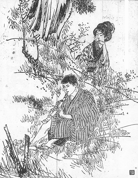 | キーワード | 高島田;黒襟;瓦斯糸太縞のきもの;竪縞のきもの;尺八;わらじ |