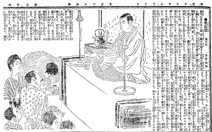説明 この時代、連載小説の題材として、目新しい開化の話題を取り上げることが多かった。写真術とか幻灯とか束髪女とかいうのがそれで、この作品もその例のひとつ。ただし、話の筋は電灯とはなんの関係もない。この場面は、伊香保の御茶屋で間に合わせの舞台を設えての素人義太夫の催しで、聴衆も気楽な感じ。この頃は上方・東京ともに寄席義太夫の全盛期だったから、湯治場の客の中だけでもけっこう一晩の番組を埋める太夫連が見つかったのだろう。(大丸 弘)