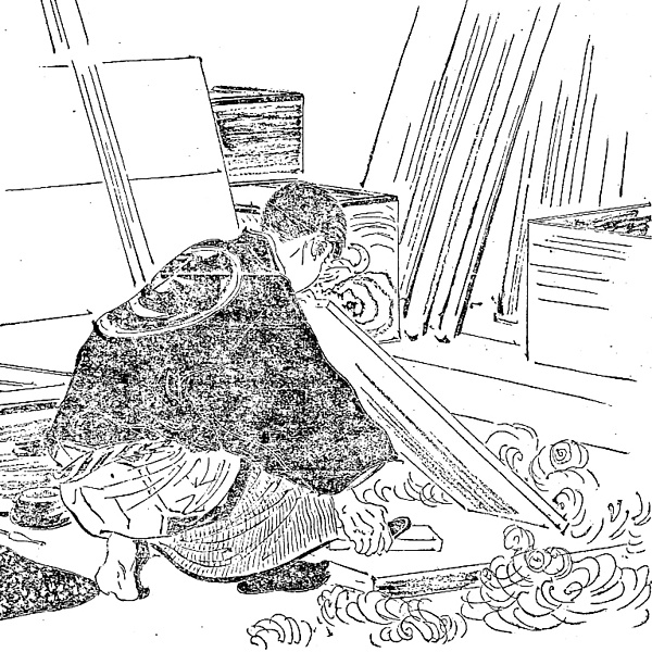 説明 鉋仕事をしているのは指物職人。大工の中でも箪笥屋など家具職や指物師などは、自分の家の仕事場にこもって作業をする居職だから、どんな恰好をしようが勝手だが、細かい木屑をいっぱい浴びるので、この男のように、厚司のような、木屑を払い落としやすくて、丈夫な生地で作った半纏に三尺を締め、紺足袋を履くのがいちばん当たり前の恰好。この職人が半纏の下に着ているのはきものだが、出職の大工や植木屋ならもちろん紺の股引に突っ掛け草履。職人の履く足袋の底は麻糸で丹念にさした刺子になっていて、そうでもなければ三日と持たない。出職の大工とちがって、ある程度の広さのある仕事場と、材料の材木置場の必要な指物師は、親方から離れて独立するのはむずかしかった。(大丸 弘)
