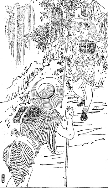 | 説明 | 箱根の山中、年長二十六,七の青年は東を背にして峠道を下ってくる。年若十八,九の青年は反対方向から登ってきた。ここで初対面のふたりが互いに身の上を語り合う、という発端の場面。すでに汽車の通っている時代だが、金のない両人は自分の足を頼りにするしかない。途中の食い扶持、宿代を考えれば、かえって高くつくのではないか。盛夏のことだから、裾まくりした単物に兵児帯、紺足袋はいつもの恰好、麦藁帽子に振分け荷物、草鞋ばきというのだけが旅支度のうち。手に持っている杖は、上りにさしかかったところでその辺の竹でも切り取ったのだろう。似たような恰好だが、いわば都落ちしてきた年長の若者は、メリヤスの股引を穿いているように見え、真夏だけに不思議。(大丸 弘) |