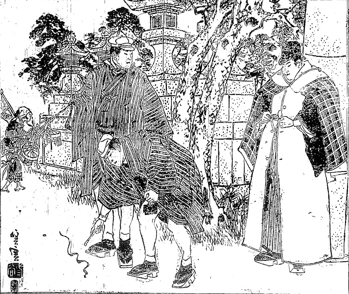 | 説明 | 大阪・住吉大社に初詣の兄弟が、道端で見かけた男のいかにも金のありそうな風態をちょっと羨む場面。その男というのは「温かそうに絹布(オカオコ)にくるまって、御丁寧に二枚まで着た羽織の上に、また温かに外套を着て、連れの芸者でも待っているのか、帯の間の金時計を入れたり出したり」という姿。下駄は堂島風で紺足袋、頭には山高帽を被って襟巻もしている。重ね法被とちがって重ね羽織というのはそう多くは見かけない。兄弟の恰好は商人風。(大丸 弘) |