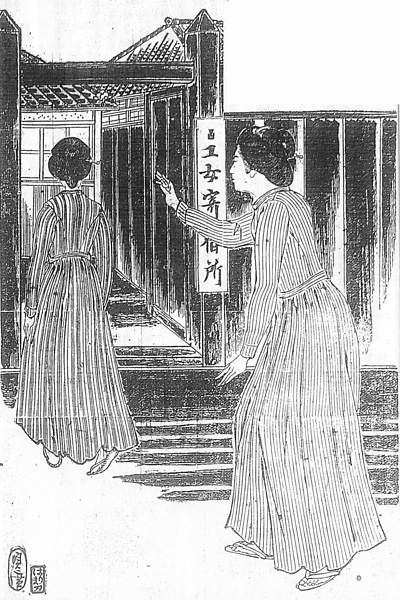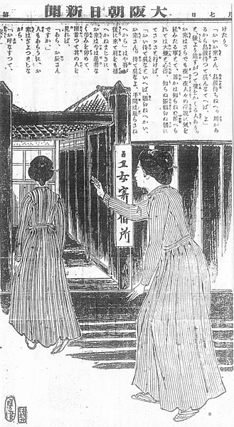 | 説明 | 二人の紡績女工。仕事を終えて寄宿舎に向かう若い女工を、先輩の女工が呼び止めている。二人とも日本髪に結っていて、ワンピース式の改良服とは、現代人の目から見るとマッチしないが、明治・大正・昭和戦前期を通じて、職業婦人と女学生の身装は試行錯誤の歴史だったから、あらゆるキッチュを見ることができる。関西ではとくに、東京に比べると束髪の普及が遅れていた。本文中で、美しいヒロインには「筒袖の職服痛ましく、あはれ紫紺の矢絣の中振袖にて、歌がるたの筵にも(……)」と同情しているように、振りを持たない女の袖は、当時の人にとってはずいぶん物足りない、あるいは間の抜けた、憐れなもののように印象づけられたのだろう。改良服はおそらく実際のモデルがあったと見え、切り替えなど構造がよく捉えられている。(大丸 弘) |