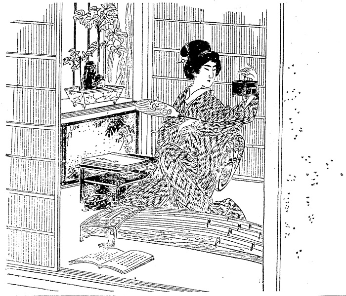 | 説明 | 阪神間の豊かな家庭。お嬢様がお琴の手すさびをしているときに、自分を刺して血を吸った蚊を下女に捕まえさせ、殺すのは可哀想と蛍籠の中に入れて飼うという。娘島田のお嬢様は右手に団扇、左手に蛍籠を持ち、立ち上がろうと片膝を立てたところで、裾を曳いている。この部屋は「数奇を尽くせる高楼(タカドノ)」とあって贅沢に設えているが比較的狭く、お嬢様はお琴を庭を見下ろした廊下際に置いている。前も後も夏向きの簀戸を立てているので、離れの二階の、風のよく通る小部屋だろう。(大丸 弘) |