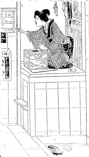 | 説明 | 東京市内のこの時代の銭湯の番台。この種の挿絵は風俗的正確さを期して念入りに描き込む場合もあるが、その時代の人なら誰でも知りきったことなので、くだくだしいことは省いてしまう場合もある。だからといって読者からの苦情もないだろうから。たとえばこの画面で湯屋の内儀の向こう側、つまり男湯の方が空白になっていることなどずいぶん奇妙だが、この日かんじんなのは内儀と女湯の側にいる主人公とのやりとりなので、それも許される。一般には番台は低い囲いがあって、その一部を開けて出入りするようになっていた。囲いの上部はちょっとしたものが置けるようになっていたから、湯銭や湯札をその上に置き、ご祝儀のおひねりを入れる小盆などもそこに置いてあった。丸髷の湯屋の内儀はまだ眉を剃っている。眉を剃った方が顔がやさしく見えると老人が言ったりするが、子どものなかには気味悪がる者もいた。(大丸 弘) |