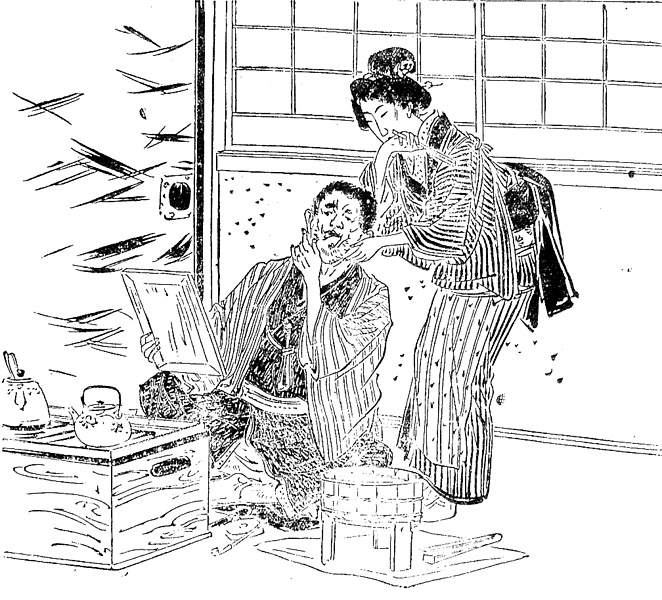 説明 女房が亭主の髭剃りをしている。安全剃刀は1880年代(明治10年代)には使われはじめているが、まだ一般的ではなかったようだ。この時代の髭剃りは盥の水なり湯なりで湿すだけで、石鹸は使っていない。このことは夏目漱石の『草枕』の冒頭の、散髪屋のくだりからもわかる。丸髷の女房の帯は引っ掛け結びで、日常的にはこれがふつうだった。(大丸 弘)