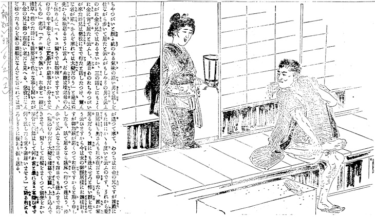 説明 おのれの妹が不始末して離縁になったのを根にもって、玄関先に座り込んでいちゃもんをつけるやくざな兄貴。実際に起こったことではなく、そんなこともあろうかというはなしの中の想像場面。古風な雪洞(ボンボリ)を持って出てきたのは若い女中で、髪は蝶々風に結って、縞のきものにも、その下の襦袢にも黒襟が掛かっているのは、それなりに色っぽいもの。照明はもう石油ランプの時代で、電灯照明も一部には入っていた。しかし常夜灯や手燭としては相変わらず蝋燭がつかわれていたらしい。凄んでいる男の恰好は芝居のしぐさそのまま。威勢のよさを見せるためこの種の男は、きものを短めに着て、彫物や身体の傷、そして毛ずねや胸毛を見せるようにする。そのための特殊な仕立て方さえあった。(大丸 弘)