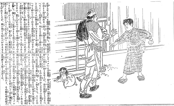 | 説明 | 滞った米代の代わりに、母親の帯を受け取って帰る米屋の前に、立ちはだかる少年。この時代は現金に代わる価値を衣類が持っていたので、盗品にも質草にも衣類が重んじられ、それだけに誰でも、着ているものや反物に目が利いたのだ。米屋の奉公人は糠を浴びるので、仕着せは白っぽいものになる。また重い米俵を担ぐため、半纏の肩に丈夫な継ぎが当たっていて、そのうえ丈夫な厚司の長前垂れをし、担ぐときそれをヒョイと肩にかける。米屋の手拭いの被り方を米屋被りというが、丁髷を結わなくなった明治期になると、もうふつうの仕事被りをして、後頭部で結んでいる人が大部分になる。この男は古風に米屋被りをしているようだが、後ろからでははっきりわからない。(大丸 弘) |