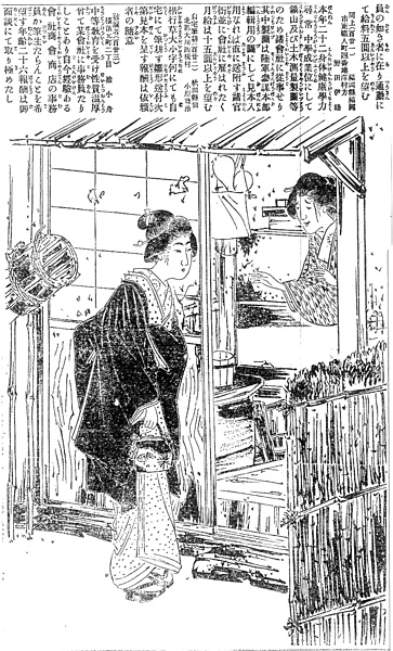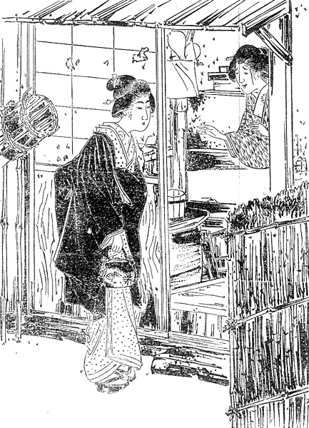 説明 離縁されて行き場がなく、葛飾辺りの、元は旗本だったらしい古屋敷に下女奉公した女。その女を訪ねてきた知り合いの令嬢。零落したとはいえ、むかしの身分に固執している屋敷の三太夫は、下女の身寄りの者を玄関には通さない。旧幕時代は武家の勝手口を御錠口(オジョウグチ)と呼んだが、令嬢はそこから上がらされた。令嬢は娘島田、小紋のきものに黒縮緬の紋附羽織、路が悪いので前褄を少し引き上げて帯に挟み、左手は袖先に隠して軽く胸を押さえる。右手に提げている袋はこのころ流行りの信玄袋とか四季袋とかいうのではなく、口金の付いた洋風の鞄。それはお嬢さんの身分を暗示しているのかもしれないし、あるいはそこに千円という大金が入っているためかもしれない。(大丸 弘)