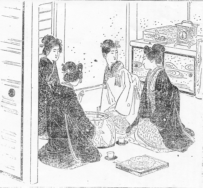 | 説明 | 女学校の同窓で、身分も富も申し分のない家のお嬢様たち四人の集い。小紋のきものに黒紋附の羽織がふたり、被布がひとり、帯付き、つまり、きものに何も羽織らない人がひとり。これはお招きしたこの家の娘かも知れない。女性の羽織は礼装ではなく寒さ避けのものだから。この女性は女性の礼装である黒の裾模様のように見えるが、まさか同窓の友人と会うのにそんな仰々しい恰好はできない。小紋は縞もの同様趣味ゆたかなものだが、維新後は江戸時代ほど好まれず、とくに若い女性には敬遠され気味だった。髪はここにいるような、嫁入を目前に控えたような女性は高島田がふつう。しかし山の手の学校出のお嬢様には、四人に一人くらいの割合で、こうした会合に束髪で出てくる人がいただろう。束髪は単純すぎて嫌う人が多かったのだが、この時代になるとさまざま技巧的な髷のスタイルも生まれ、またこのお嬢さんのように、日本髪とはべつのおもしろさをもった、華やかな髪飾りを工夫する人も現れていた。(大丸 弘) |