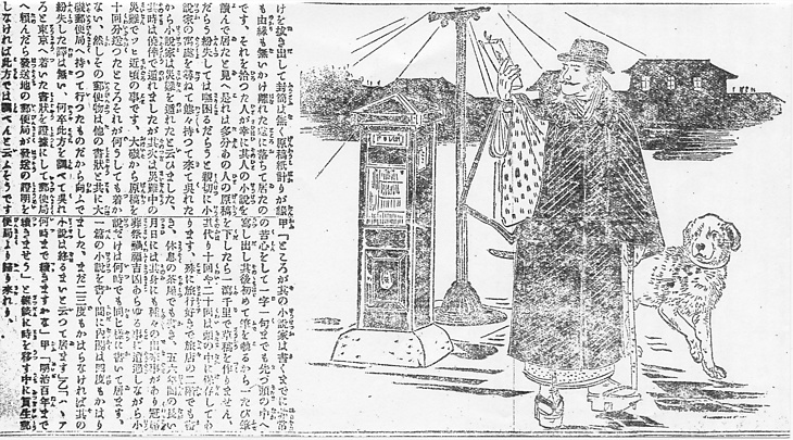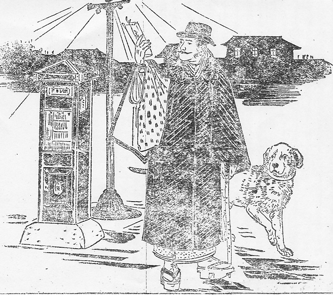 キーワード 中山高帽;八字髭;シャツの袖;飛白のきもの;[インバネス;トンビ;鳶(とんび);二重回し;二重廻し;二重外套;二重マント];のめり下駄;犬;郵便ポスト;街灯