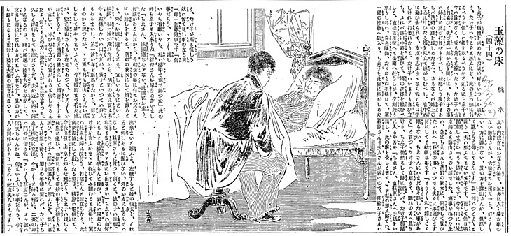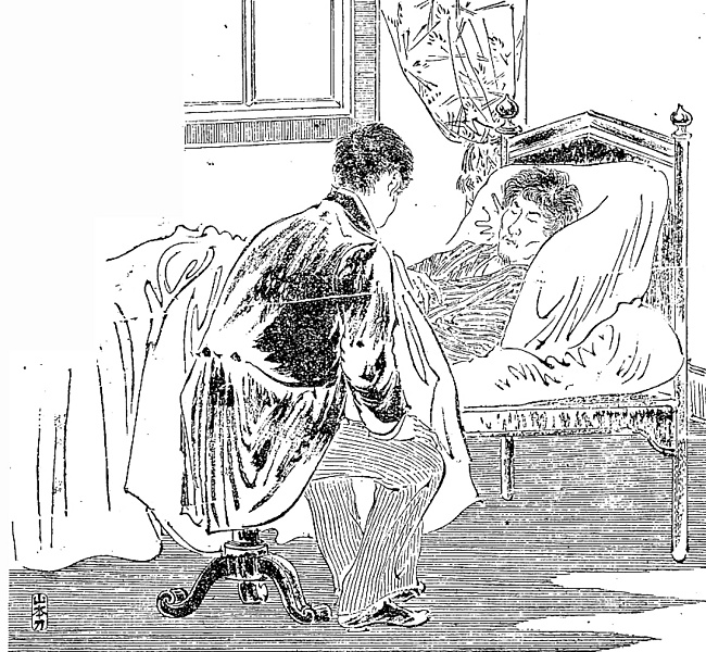 | 説明 | 病床の男と見舞客。日本人が西洋風の生活を体験した最初の機会のひとつは、大きな病院に入院したときだったろう。もちろんそういう体験を持った人は多くはないのだが、病室の内部の設えや病人の起き臥しの様子は、見舞客にも理解できる。小説作品の中にも病院への見舞いの場面は――夏目漱石の『三四郎』の東大病院のような――けっこうあるものだ。それに比べると、西洋風ホテルに宿泊する機会はずっと少なかったろう。この挿絵の狭い視界の中でも、洋館式の窓とカーテン、上半身が凭(モタ)れるようにクッションのセットしてあるベッド、真っ白なベッドカバーとシーツ、そして見舞い客の座っている回転椅子など、どれもこの時代の中流以下の日本人の家庭にはめずらしいものだった。白いシーツは1910年代には順調に日本人の生活に溶け込むが、白い布団カバーは戦後になっても、病院の布団みたいだと言って嫌う人があった。クッションに凭れる、という寝方は、結局、日本人の多くには受け入れられなかった。(大丸 弘) |