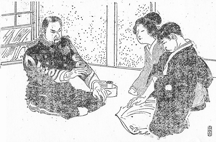 | 説明 | 園遊会のさなかに一人娘の行方が知れなくなった陸軍中将、園遊会を催した伯爵夫妻と額を集めている。一般人が軍人の金モール付きの礼装を見る機会は、ふつうは年始の参内の馬上や馬車のなかくらいだが、文官や一般人が燕尾服であるような会合、宴席には、もちろんこの恰好で出席する。1886(明治19)年以後、明治年間を通じて陸海軍の服制は全体としての改正はなかった。礼装はかなりの高額のもので、もちろん個人の負担だから、一代で一回新調する、というようなコスチュームだった。(大丸 弘) |