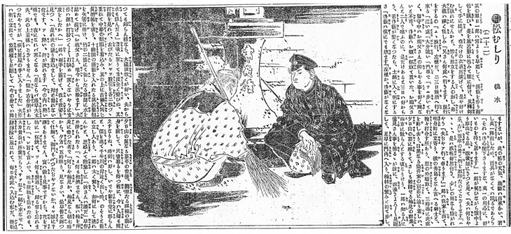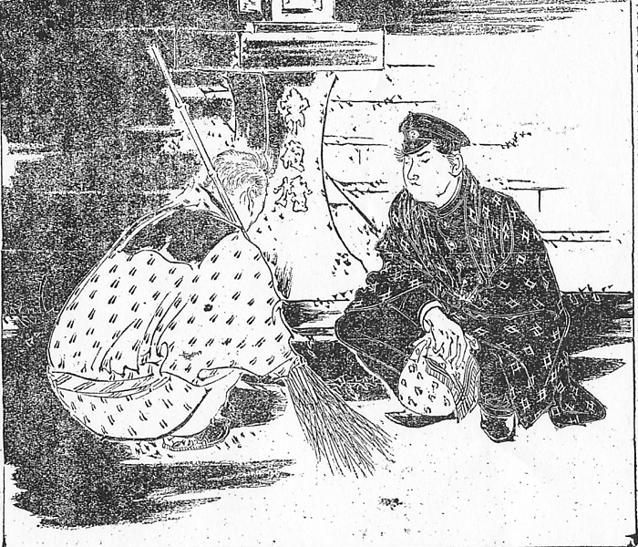 説明 梅花見物にこと寄せて人の地所に忍び込んだ若者を、見とがめた庭掃除の老人。説明によれば若者は夜の寒さに備えて、シャツ、股引を各二枚、中学の制服、綿入れのきものと羽織を着込んだ、とある。防寒については前代まで綿入れのきものに頼っていたので、どうしても外衣中心だった。肌着下着といえば汗取りと考えられる傾向があった。起毛した織物、あるいは毛織物、毛糸を、肌着や中間衣への利用が普及するのは、明治末以後のことだった。(大丸 弘)