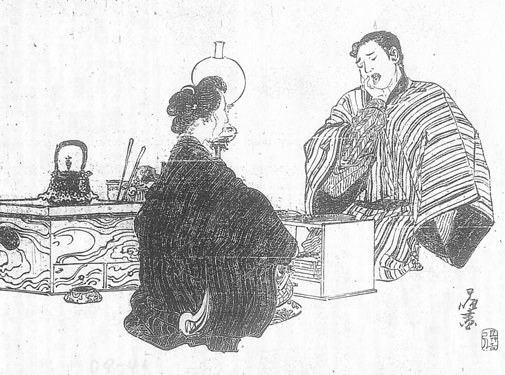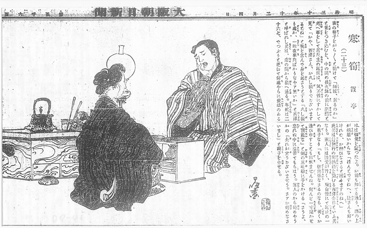 | 説明 | 清元の師匠の処へ立ち寄ったついでに、「落人(オチウド)」の稽古をしている男。「落人」は忠臣蔵三段目のアレンジもの。東京でも大阪でも遊芸のお稽古所は多く、大阪では義太夫が絶対、東京では常磐津、清元、長唄の方にいくぶん人気があった。稽古所に通うのは子どもが多かったのだが、二十代,三十代の男もけっこう熱心で、そのせいでもないだろうが師匠には圧倒的に女が多かった(→年表〈現況〉1889年1月 「東京府下の芸人の数」都新聞 1889年1月6日3面)。男は銀行員でこれから関西へ出張というので、Yシャツの上に丹前を羽織って立ち寄ったようだ。二十六,七という師匠は「田舎銘仙の着物に、おなじ茶縞の羽織を着流して(……)」とあり、たいていは芸者上がりだが、ズブの堅気の芸達者もけっこういたらしい。(大丸 弘) |
