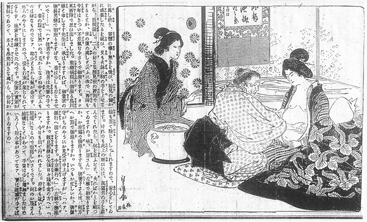 | 説明 | 七カ月の妊婦を見舞う産婆。本文のくわしい衣裳付けの中で、若い妻がこの時代、もはや白歯であるのを、作者の渡辺霞亭は「嫁も昔ならば、含鐵漿(フクミカネ)の口辺(クチモト)可愛ゆく」と言っている。かたわらの母親は眉も落としているようだ。女の髪はみな丸髷だが、かたち大きさは年齢に従って三人三様。(大丸 弘) |