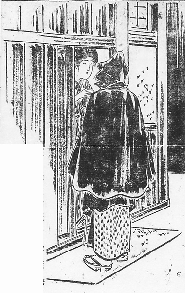 | キーワード | 頭巾付き合羽;飛白のきもの;羽織の裾;のめり下駄;後ろ姿 |