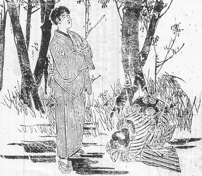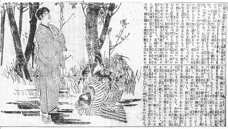 説明 この挿絵の男女の姿は、本文の内容とはかなりのちがいがある。娘は男を慕っているし、主人筋になる若者も娘に優しい気持ちはあるのだが、しかし互いにそのことちをはっきり打ち明けたわけではなく、「彼は天上に純潔なる天使と、並び立てる心地して、お栄が打ちふるい居る手をしかと握りぬ」というまでの状態がストーリー。女性が突っ伏してお尻を高く持ち上げるポーズは、畳生活から生じた独特の、嗚咽、あるいは激しい哀しみの表現だが、地面でそれをやる例はもちろん少ない。(大丸 弘)