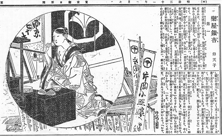 説明 役者は鬘(カヅラ,カツラ)を被るために大きな髷をつくることはできない。男女とも髷を結っていた江戸時代には、そのため役者は特殊な髪を結っていた。それが楽屋銀杏とか、鬘下(カヅラシタ)髷とかいうもの。明治になって男が散髪になるとその必要もなくなったので、楽屋銀杏は女役者だけのものになる。事例を見ると形はかならずしも一定ではないが、銀杏返しの変形が多いようだ。銀杏返しという髪型が、もともと平べったい形のものだからだろう。帝劇女優ができるまで女の役者がいなかったわけでは決してない。1889(明治22)年の東京府の調査では、男役者が 2,056人、女役者が317人、とある(→年表〈現況〉1889年1月 「諸芸人 其筋に於て調査せし昨年十二月廿八日府下現在諸芸人の数ハ左の如くなり」都新聞 1月6日3面;朝日新聞 1889年1月6日4面)。(大丸 弘)