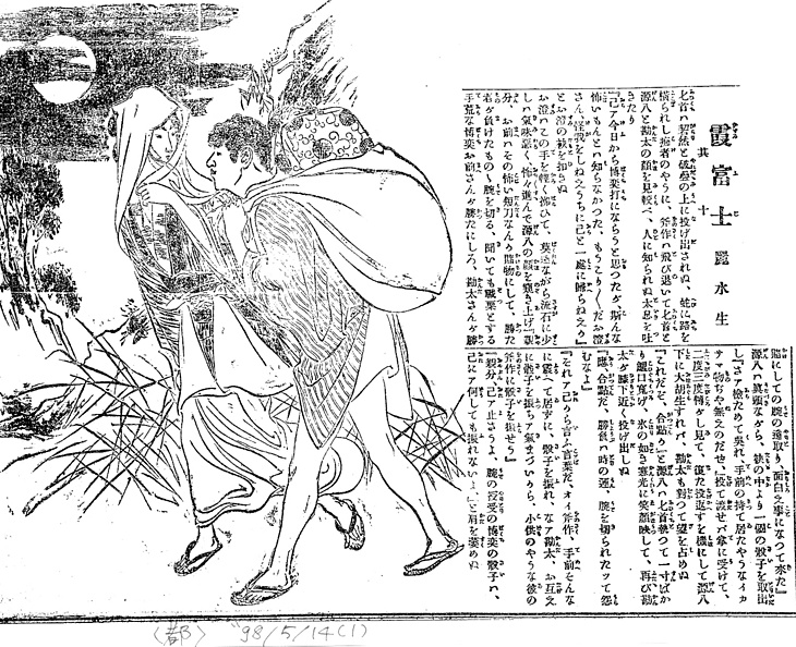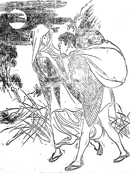説明 本文より挿絵が一日先行している。博打に負けて命を取られる羽目になった若者と、その女とが夜道を逃げてゆく。大風呂敷を背負った男は尻を高く端折って草履ばき。女の方は手拭いを、ただふわりと髪にのせているだけで、これは吹き流しと呼んだ。舞台ではその片端を軽く口にくわえるのがひとつの姿。女性の裾端折りは、両方の前褄を引き上げ、左右に分けて帯の下に突っ込み、湯文字(ユモジ)を見せる。この絵では女の右手の様子がはっきりしない。(大丸 弘)