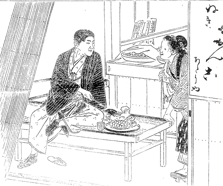 | 説明 | 〈遡及資料〉団子屋の店先で、母親からひどい折檻を受けている男の子を憐れんで、男の子の生い立ちなどを店の女房に尋ねている客。女房の歳はわからないが、丸髷の髷の大きさからみて四十は越していないだろう。話は1870(明治3)年,1871(明治4)年のことなので、女房が眉を剃っているのは当然。黒襟のかかった、裾の短い縞のきものをゆるく着て、前垂れ掛け、足駄ばきというのは、もっとも当たり前の小商人の女房の恰好。客は小紋のきものに縞の羽織を重ね、紺足袋に草履ばき。煙管を持ってものを言っているが、男は外出には必ずといっていいほど煙草入れを腰に提げ、短い刀豆(ナタマメ)煙管をとりだして一服つけたもの。(大丸 弘) |