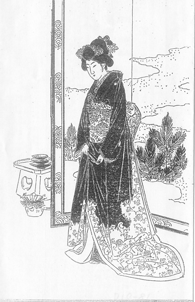 説明 主人公の捨吉は十二,三で靴屋に奉公に出されたが、妹の梅子は同じ年頃になると芸者屋に売られ、二十にはまだ間がある年頃で、西南戦争(1877年)の前の年、鹿児島のある軍人の妻となるために落籍される。年齢は親子ほどもちがったが。挿絵は三三九度の杯事の夜の花嫁姿。この時代は大家は大家なりに貧乏人もそれなりに、とにかく杯事は嫁入り先の家の一間で、それも夜におこなうのがふつうだった。打掛を着ることは稀だった。綿帽子は被れば現在のものよりずっと深く、覆面じみたものだったためか、素面が多かったようだ。高島田の懸物、飾りは多かったが、筥迫(ハコセコ)はまだ知られていなかった。きものは黒の裾模様で、花嫁衣裳というより女の礼装として用意されるものだったから、貸衣裳などなかったこの時代、あと役に立たない大振袖などを着る花嫁は滅多になく、多くは留袖だった。振袖のこの花嫁は、その点は芸者の出らしいといえる。(大丸 弘)