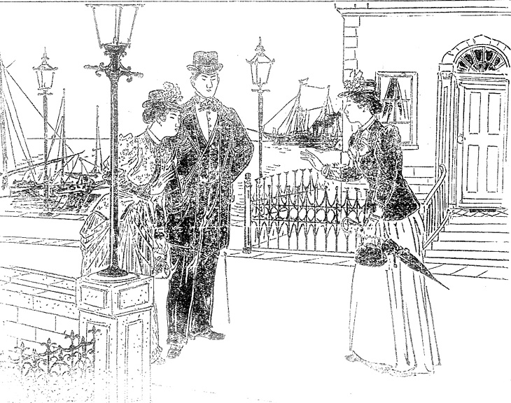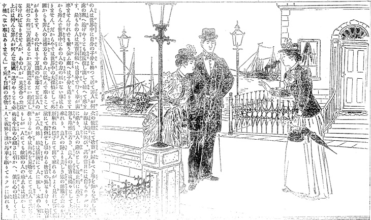 | 説明 | サクセスストーリーの大団円に近いところ。海外で財をなした紳士とその妹が、図らずも横浜の埠頭で、上の妹と再会するシーン。横浜のメインストリートには、東京より早く西洋風のガス灯が設営されていたから、夕暮れ以後になると、明治の開港場らしいエキゾチックな街のたたずまいがあったにちがいない。挿絵画家は十九世紀末の欧米のファッションをよく勉強して描いている。袖付けの独特な盛り上がりは、当時制定された看護婦の制服のデザインとして長く残った。もっとも、そのお手本のスタイル画に近すぎて、明治の日本女性の身体ではなくなっているが。右側が芸者をしていた姉の方で、パラソルと一緒に持っている婦人持ちのハンドバッグも、何年もあとになってから、銀座を歩く日本女性の必需品になるもののさきがけ。(大丸 弘) |