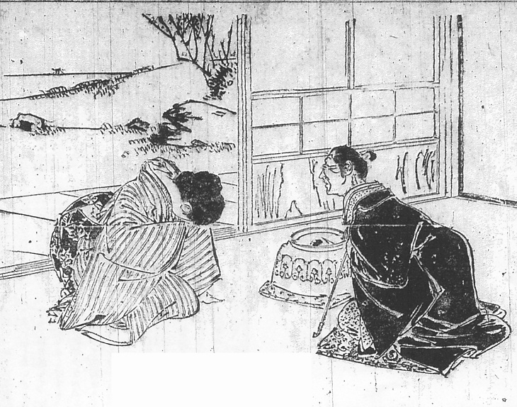 | キーワード | 黒紋付き羽織;長煙管(きせる);竪縞のきもの;お太鼓結び;袖口で涙をぬぐう;火鉢 |