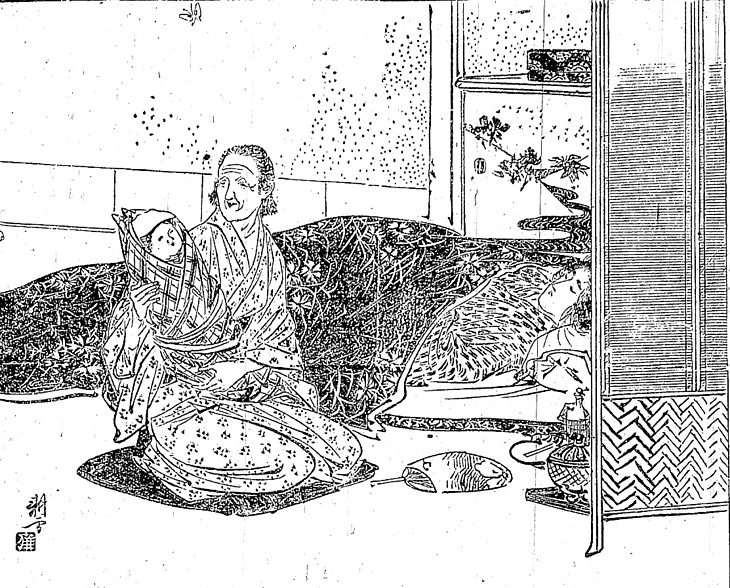 | 説明 | まだ学生の身で子どもを抱える身になったヒロイン。掛けている布団がこの時代としてはめずらしく掻巻でないのは、時季が夏だからだろう。シーツはまだ幅の狭いタイプ。束髪のヒロインは、もう古風な高枕の必要はないので括り枕をしている。それに比べて赤ん坊は古風に、蓑虫のようにくるまれている。赤ん坊を抱いている老婆は切り髪。未亡人がよく切り髪をしたが、たいていは奥様といわれるような身分の人だった。(大丸 弘) |
