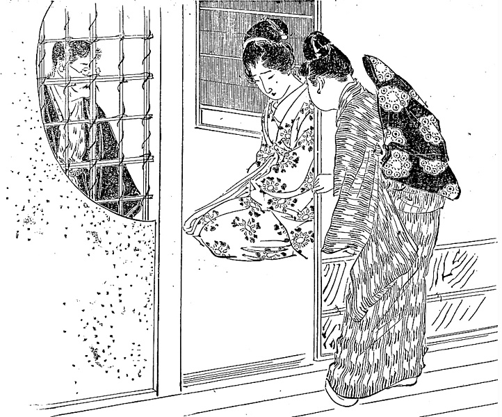 | キーワード | 総柄のきもの;稚児髷;矢羽のきもの;竪矢の字;立て矢結び;格子の明り取り;簀戸(すど);簾戸(すど);葦戸(よしど);廊下 |