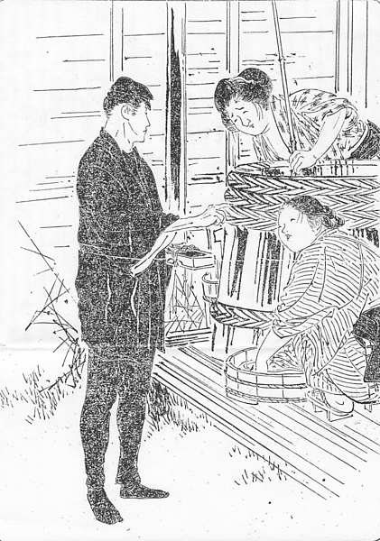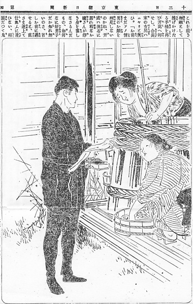 説明 井戸端のおかみさん連中に訪ねる家を聞いている「黒鴨仕立キリヽとせし、二十五六歳位なる馬丁(ベットウ)風の男」。ふつう職人の着る半纏・股引は濃紺だが、車夫・別当の着ているのは黒にかぎり、人力車が消滅する大戦間際の時期までそのスタイルは変わらなかった。黒鴨と異称のあったのはそのため。別当と判断されたのは被っている帽子のためもある。学生帽として一般化したこの形の帽子は、明治初期に軍人や警官の制帽として制定されたのが初め。ただし馬丁の被っているのはごく小さいのが特色。しゃがんで桶の中のものを洗っているらしいおかみさんの頭は、じれった結びという、洗い髪の処理法のようでもあるが、髪のあまり多くない人が適当に丸めているだけで、名前などつけようがない。(大丸 弘)
