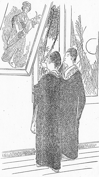 | 説明 | 展覧会場の美人画の前でことばを交わしている女性は、いずれも吾妻コート。「緑の黒髪を無造作に揚巻に束ねて、黒の綾羅紗頗る上等と見らるる吾妻上衣(コート)を着し(……)」とある。隣の女性も吾妻コートで、これは「色の黒い品のわるい」婦人だというのだが、挿絵でそれを描き分けるのは無理。被布や道行をやや変形して毛織物を使用したのが吾妻コートの創意だった。この時代には襟の形を中心にデザインも年々変化し、生地も毛織物にかぎらなくなっていて、吾妻コートの定義も漠然としはじめている。この時代、各種展覧会、博覧会は多くの人を集め、中でも文展など絵画の展覧会には、知的好奇心に目覚めはじめた女性たちの、幅広い支持があったようだ。(大丸 弘) |