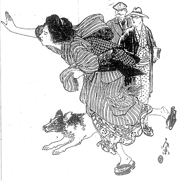 | キーワード | 竪縞のきもの;袂の扱い;走る;犬 |