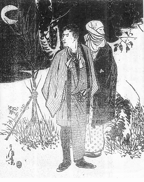 | 説明 | 夜更けにあたりに気を配りながら、悪事の相談をしている男女。男は職人のみなりで、脚さばきのいいように片裾をまくりあげ、受けとった報酬の「二百円の紙幣を内懐へ納めたり」というところ。財布など大事なものは内懐(うちぶところ)、つまり帯下の臍のあたりにしっかりと挟む。これによって胸のあたりにしまりができて、懐のかたちができるという。だからその財布の出し入れはふところ手になる。(大丸 弘) |