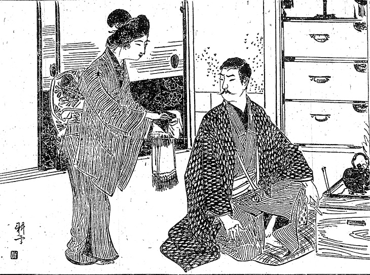 | 説明 | サクセスストーリーの逆で、将来も保証された官吏の身でありながら、相場に手を出して失敗、貞節な妻をも捨てて家出したあげく、車夫にまで身を落とす男の物語。主人公は髭を蓄えていて、その末端が上に跳ね上がっているのはカイゼル風ということになる。開化期には髭といえば紅毛の異人を意味したが、この時代には官員さんを陰でいう言い方になっていた。軍人以外の官員さんたちがあまり髭を生やさなくなったのは、第一次世界大戦の結果、カイゼル髭の本家、プロイセン王のウィルヘルム二世(在位1888~1918)が失脚したせいもあるかもしれない。ただし、そのカイゼルの髭は、末端を直角に近く上に跳ね上げていた。主人公はこれから銭湯に行くので、妻が、「石鹸と手拭と呉羅(ゴロウ)の布の垢擦」、それに三銭の湯銭を手渡されている。銭湯の男湯へ、こういう立派な髭のおじさんが、それほど立派でもない体つきで、石鹸箱や手拭いで前を押さえて入ってくると、子どもなどにはなんだか場ちがいな、滑稽なような、ときには可哀想なような感じがあったそうだ。(大丸 弘) |