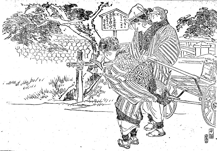 説明 東京の芝、虎ノ門に近い辺りを行く炭団(タドン)売りの親子。炭団は木炭の粉に布海苔などの粘着料を加えて団子状にしたもの。火力は弱いが行火などには向いていた。炭の粉は大きな炭屋だとタダ同然でくれた。炭団売り、蜆(シジミ)売り、鰌(ドジョウ)売りなどというのは元手要らずに、子どもでもできる商売だった。「親子いずれも肌薄の拵えにて、古布子の裾を端折り、脚半草鞋に踏み〆むる、朝な朝なの霜柱」という哀れさ。娘の方は十二,三といえば、貧乏人の家ではまず例外なく、子守にやるか、手内職の手伝いをさせても、けっこう役に立つ年頃、母親もまだ三十そこそこだろう。もうすこし身に合った収入の方法が見つけられそうなもの。ねんねこ半纏にくるまっている赤ん坊は正チャン帽のような帽子を被っている。少女の髪は「母の手ずさみと覚しき蝶々髷」。(大丸 弘)