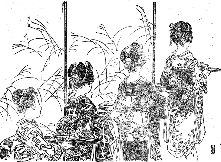 | 説明 | 料亭の二階での、七十人の大一座の宴会がこれからはじまるというところ。廊下に控えていた半玉、つまり雛妓(オシャク)たちが、会席膳を持ち運ぶ。お座敷では黒の「出の衣裳」を着る一本の芸者とちがって、まだ子ども並みの雛妓は、思いきって派手な友禅の総模様だから、座敷にぱっと花が咲いたようになる。しかし、ふつう配膳は、料亭の女中の大事な仕事のひとつで、それに子どもが駆り出されることは滅多にない。この絵での雛妓たちは帯をみな、お太鼓に結んでいる。しかし、雛妓の華やかさは、竪矢や文庫など大人では大仰すぎる帯結びにもある。髪は先頭の子が桃割れ、次の二人が唐人髷、四人目の子は側面ではっきりしないが、たぶん桃割れだろう。唐人髷は桃割れより少し年の行った子、と説明する資料もあるが、この時代は唐人髷が流行していたのに、大正期(1912年~)に入ると急速に忘れられてしまう、というふうに、そのときどきによって一概にはいえない。(大丸 弘) |