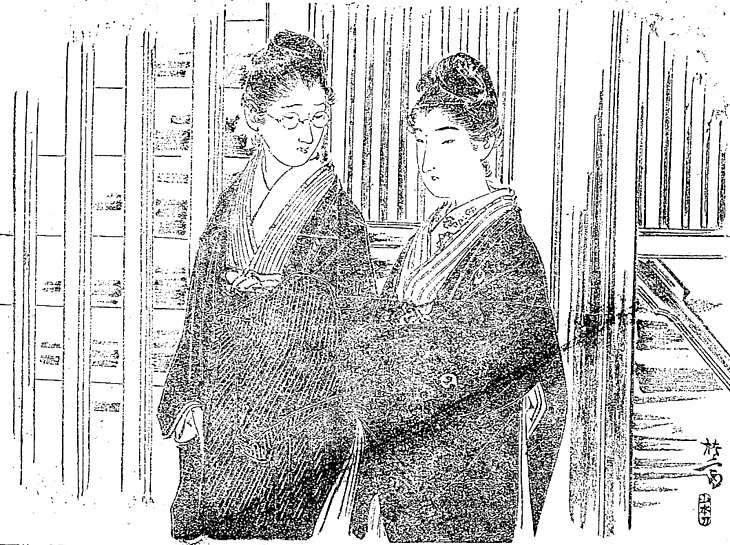 | 説明 | 夫の心得違いからすっかり零落した一家、その貧しい家を訪れたのは夫を誘惑したうえ、家財を失うほどの投資に誘った張本人の女。第77回のその眼鏡の女は、髪は銀杏返し、黒紋附の羽織の上に、糸瓜(ヘチマ)襟のコートを重ねている。つぎの第78回では前非を悔いて誘惑した夫の妻であるヒロインに、両手をついて詫びている。ヒロインは乳飲み子を胸にして、学友である友人の告白と詫びに、当惑し、返事に窮している。いまは明日の米にも苦労する身で、下町風の襟対の縞のきもの、引っかけらしい帯は畳についている。女性も正式には男と同じような黒紋附を着る習慣は、このころから定着しはじめた。その場合、格式にこだわるなら、きものは小紋の白襲になる。ヒロインは女の詫びを入れたうえ、その勧めに従って、裁縫教員として職業に就くこととなった。第79回はそのヒロインが、頭を結い慣れない束髪に結い変えて、かつての恋仇の女性とともに家を出る姿。友人は第77回,第78回と変わりないが、ヒロインは黒縮緬の羽織に細縞のきもの、髪は慣れない束髪。この束髪は、前の日髪を洗ったばかりというヒロインに、「束髪になさるとちょうどいいじゃありませんか」と言って、「きのどくがるを強いて夜会に結び了りぬ」とある。相手の女の束髪についてはなにも言っていないが、この時代の上げ巻の束髪は、一般に、髪を捻って上げる傾向が強いようだ。(大丸 弘) |