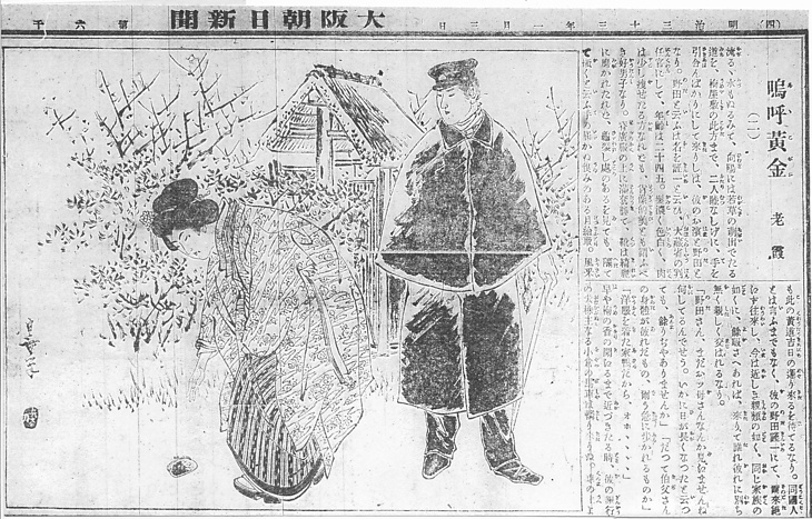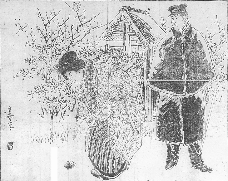 | 説明 | 水ぬるむ頃の大阪梅屋敷辺を散策する男女。二人はこの4月には結婚することが決まっている間柄。梅屋敷という場所は数多くあり、大阪にも上九あたりと箕面にあったらしいが、背景の茅葺きの門から見てこれは箕面の方かもしれない。男の方の年は二十四,五、「背広服の上に満套(マントウ)着て、靴はきれいに磨かれたれど、ひび割れし処のあるを見ても手の届かぬ恨みのある月給取り」とある大蔵省の判任官。判任官は明治の官僚制度では勅任官奏任官の下で、高等官というのは上の二階級を指す。官立中学を卒業すると無試験で判任官になれる時期もあった。着ている満套というのはあまり見かけない当て字で、要するに二重外套。寒いと見えて首巻をし、ステッキを持っているのはいいとして、学生帽風の帽子を被っているのは現代から見ると違和感がある。このかたちの帽子は軍人や鉄道員など下級官吏には広く用いられていた。(大丸 弘) |