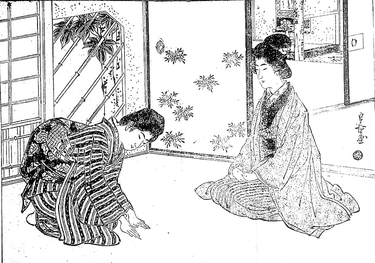 | 説明 | 主人公は夫から遁(ノガ)れて身を隠している妻。名古屋市内の口入屋から、郊外の別荘に住む若奥様のお側仕えとして住みこむ。奥様はまだ十六だがそれでも人妻、きちんと丸髷を結い、背筋を伸ばして新参の奉公人の挨拶を受けている。主人公の束髪はとりわけ第11回では頭頂部が盛り上がっている。束髪はたいていは自分の手でまとめ上げてしまうので、日によって形も一定しないだろうが、第11回くらいの高さになると、すぐあとの時代に流行する、下田歌子式と呼ぶ突き出た前髪のスタイルの兆しが見える。(大丸 弘) |
