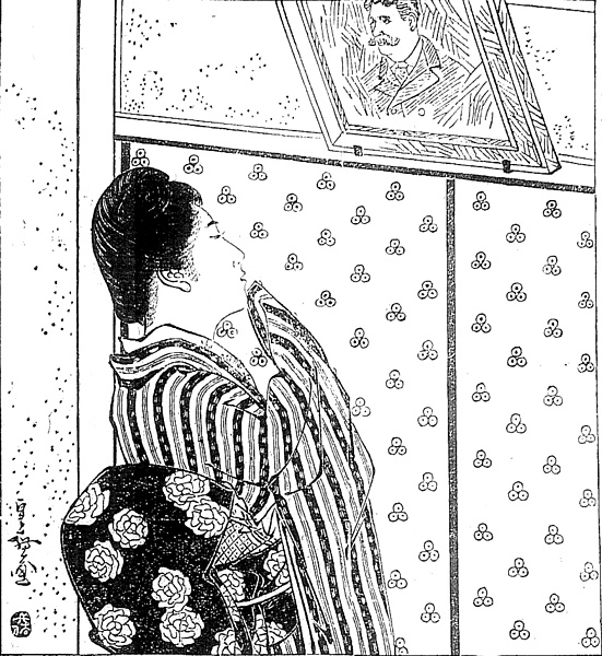 | 説明 | 主人公は夫から遁(ノガ)れて身を隠している妻。名古屋市内の口入屋から、郊外の別荘に住む若奥様のお側仕えとして住みこむ。奥様はまだ十六だがそれでも人妻、きちんと丸髷を結い、背筋を伸ばして新参の奉公人の挨拶を受けている。主人公の束髪はとりわけ第11回では頭頂部が盛り上がっている。束髪はたいていは自分の手でまとめ上げてしまうので、日によって形も一定しないだろうが、第11回くらいの高さになると、すぐあとの時代に流行する、下田歌子式と呼ぶ突き出た前髪のスタイルの兆しが見える。(大丸 弘) |