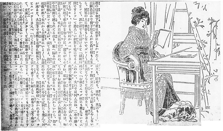 説明 洋風の贅沢な部屋で読書しているお嬢さん。お嬢さんの頭は高島田でいろいろな飾りがたくさん付いている。襟はやや抜き、前も開け気味なので半襟が大きく見えている。このくらい見せるとなると、確かに男性のネクタイ以上に相手の目を引くだろう。帯揚げはこの時代としては出している方で、派手な好み。裾を少し割っているが、襲(カサネ)であるらしく、しかもかなり厚い出袘(デブキ)が見えるので、もちろんふだんの恰好ではない。(大丸 弘)