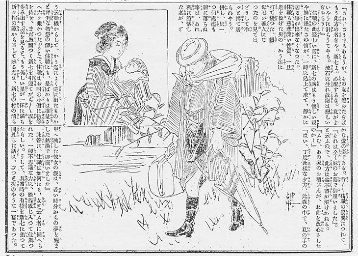 | 説明 | 男の姿は、商売はなんだかわからないでも「重々とさげた鞄と風呂敷包、身には薩摩飛白に紺無地の博多帯と云う、極質朴な服装(ナリ)をした商人(アキンド)風」だ。ただし、本文では絣となっているが、挿絵は縞物、帯も無地ではないが、しかしこの風態は旅の商人以外の何者でもない。足拵えは脚絆に靴、ではいくぶんキッチュなので、黒っぽい、その時代に言い方だと靴足袋=靴下と靴だろう。その足拵えと、中折のフェルト帽、革鞄、蝙蝠傘が、まちがいなくこれが明治の末、ということを示している。(大丸 弘) |